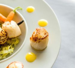 Noix de stjacques rôties, bouillon thaï à la citronnelle , crème de choux fleur et coques